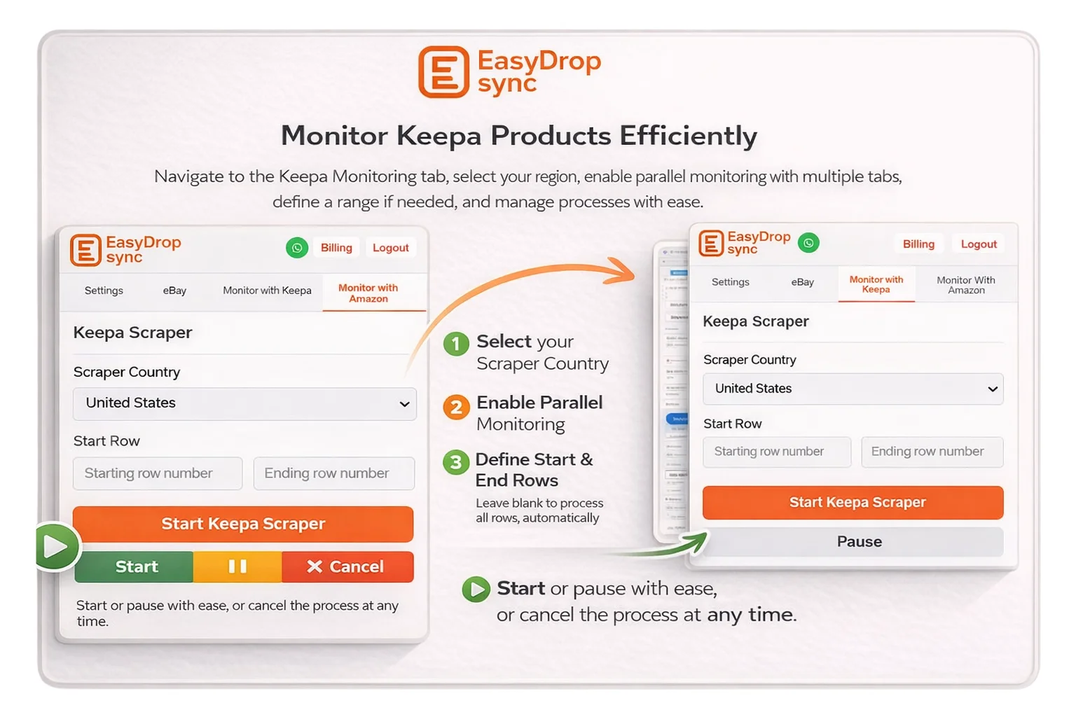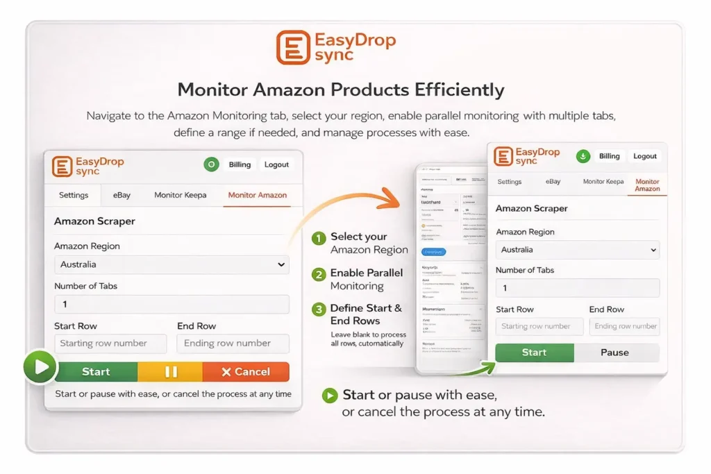 Navigate to the Keepa Monitoring tab and complete all required settings. Second is from Keepa, and you can adjust price formulas in the extension settings page. Select the region and use multiple tabs to monitor products in parallel for faster performance. You may specify a starting and ending row; if left empty, all rows will be considered. Once configured, start the process. A pause option lets you resume, and a cancel option stops the process anytime.